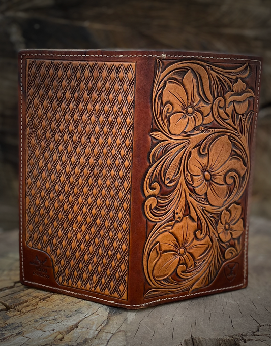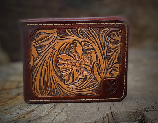 Handmade Leather Wallet with Floral Carving - Money Clip Style